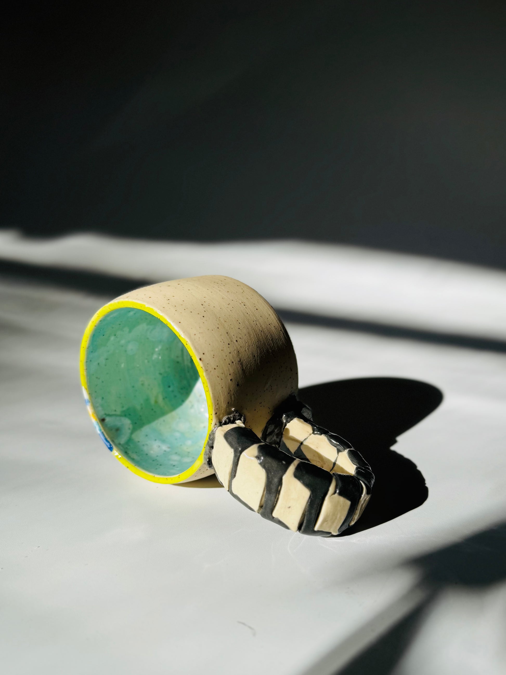 - Lines converge to form snowy mountain peaks against a speckled clay boft, featuring a Nerikomi-style braided handle. Sea green interior, Chartreuse rim.