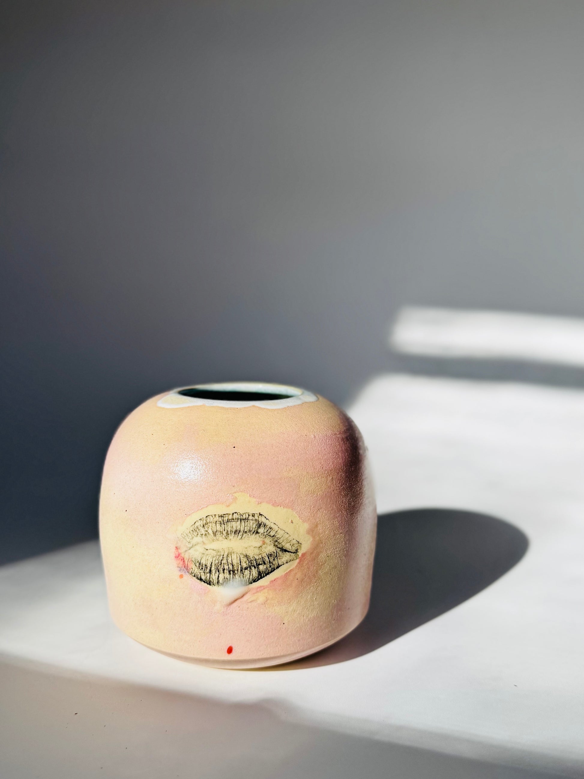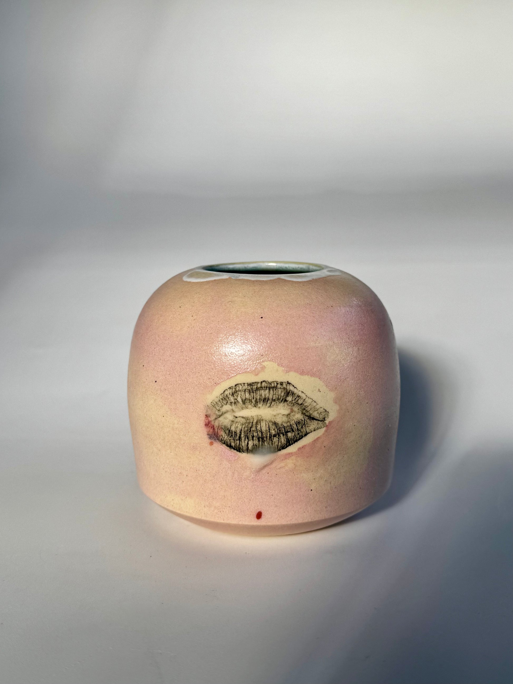 - Lip motif stamped using black underglazes to transfer from my own lips; this form of expression is potentially toxic & not recommended.