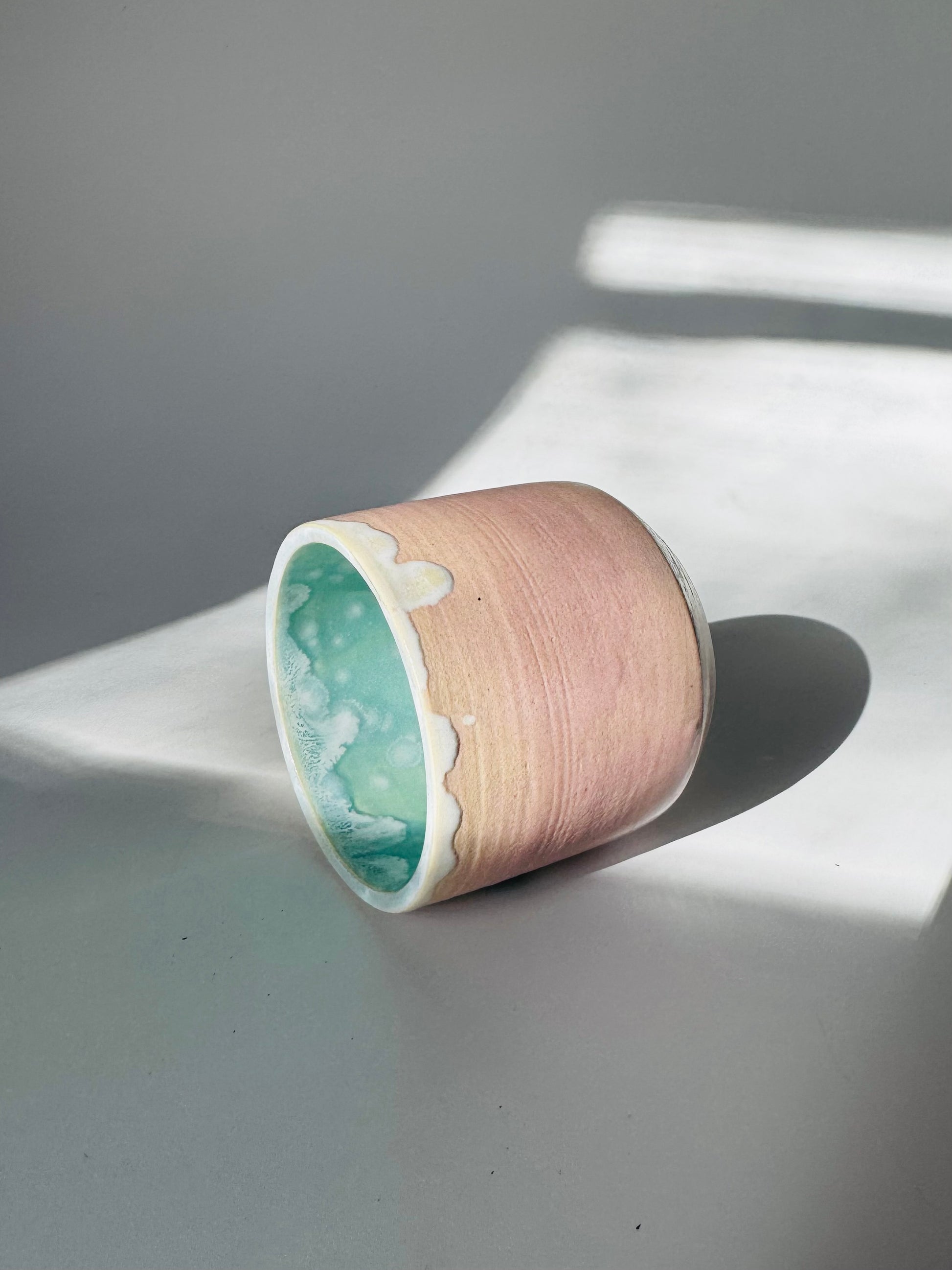 - Pucker up for your new favorite daily ritual with a smooch from yours truly. Cascading flux runs at rim, featuring various shades of sea foam interior with celadon blooms.
